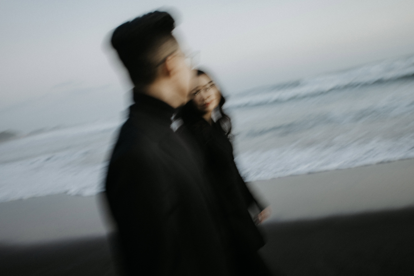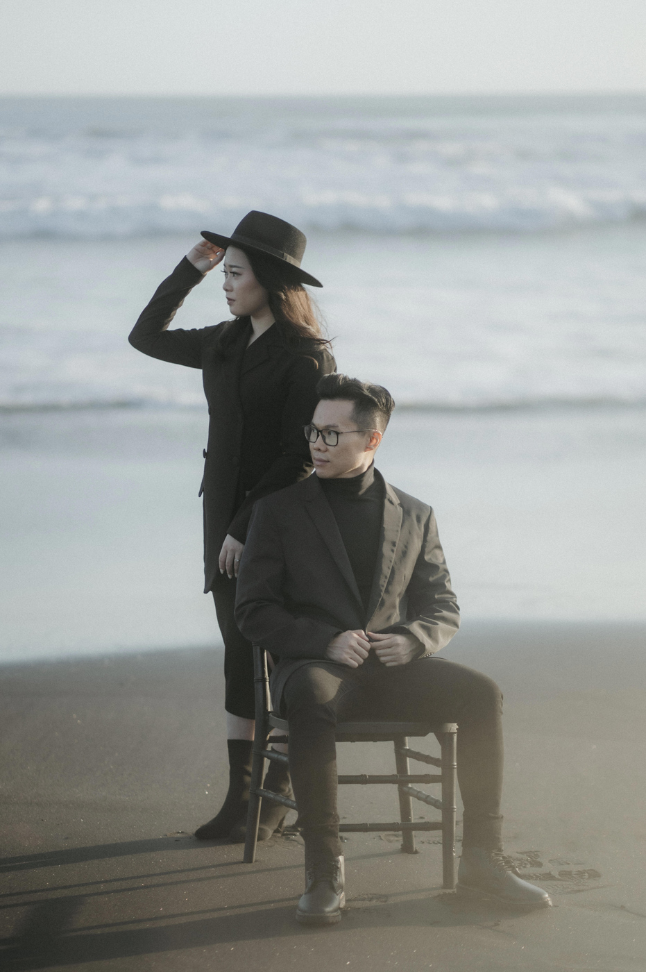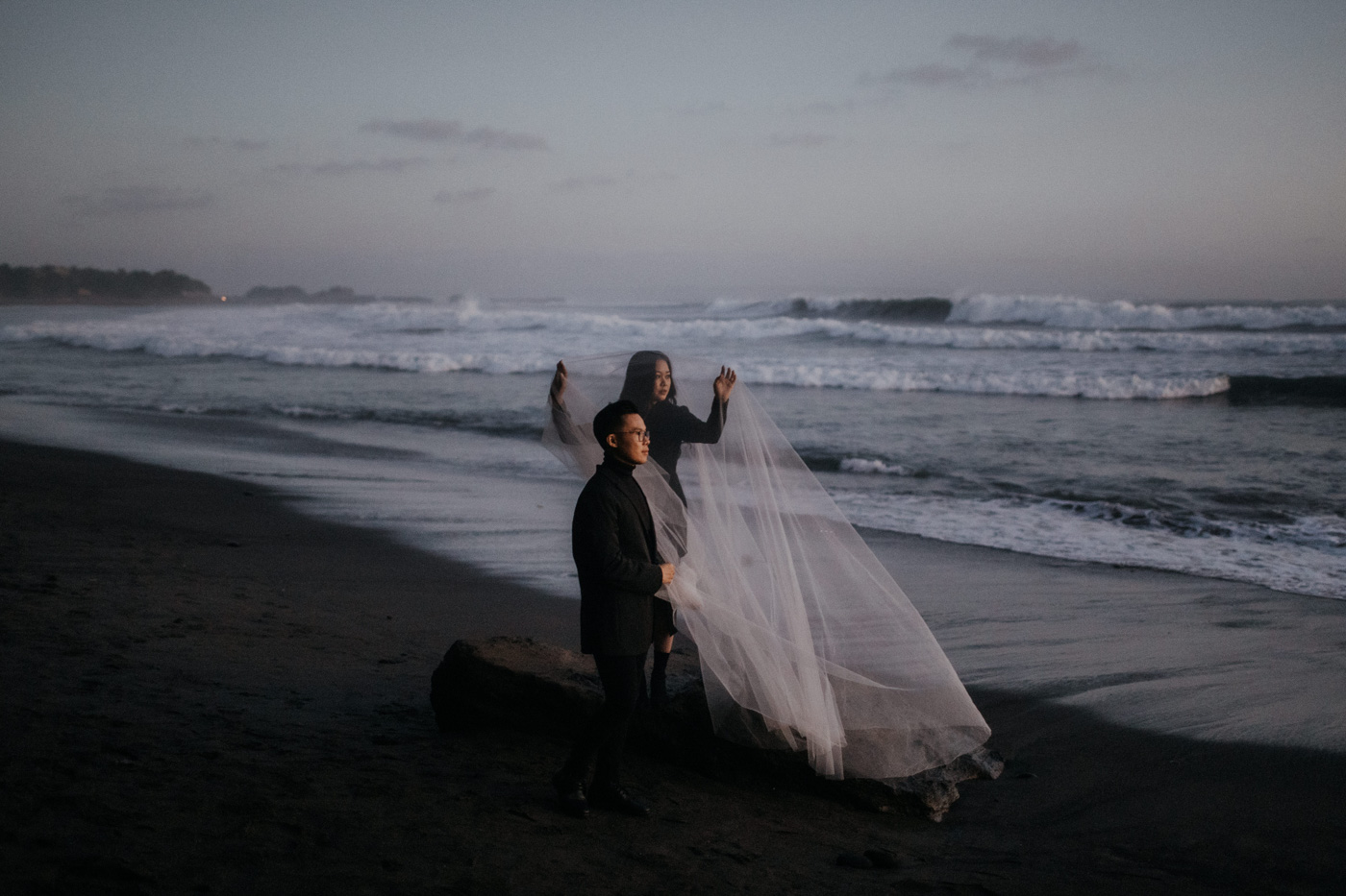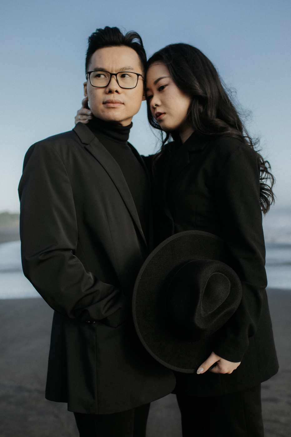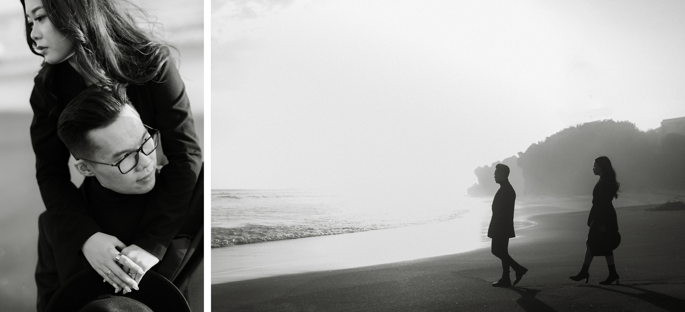 In Bali's enchanting embrace, where the ocean's whispers meet the shore's gentle caress, the couple stands, resplendent in sleek all-black attire, a striking contrast against the golden black sands and azure waters.