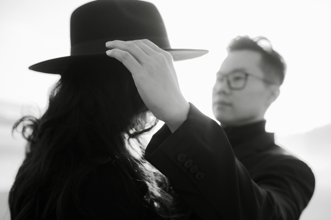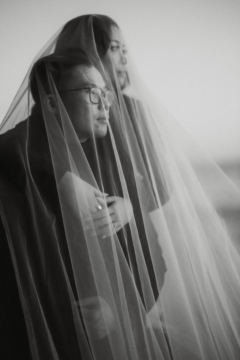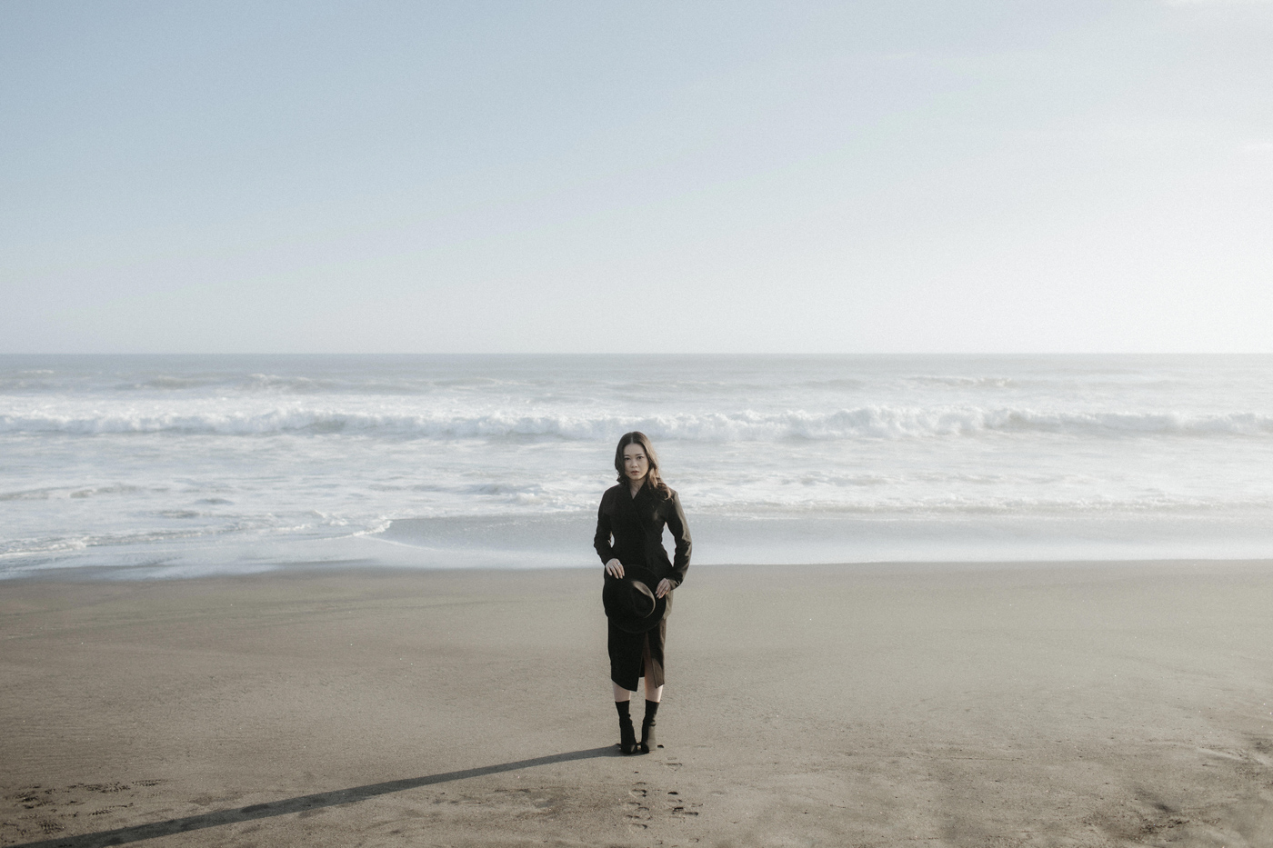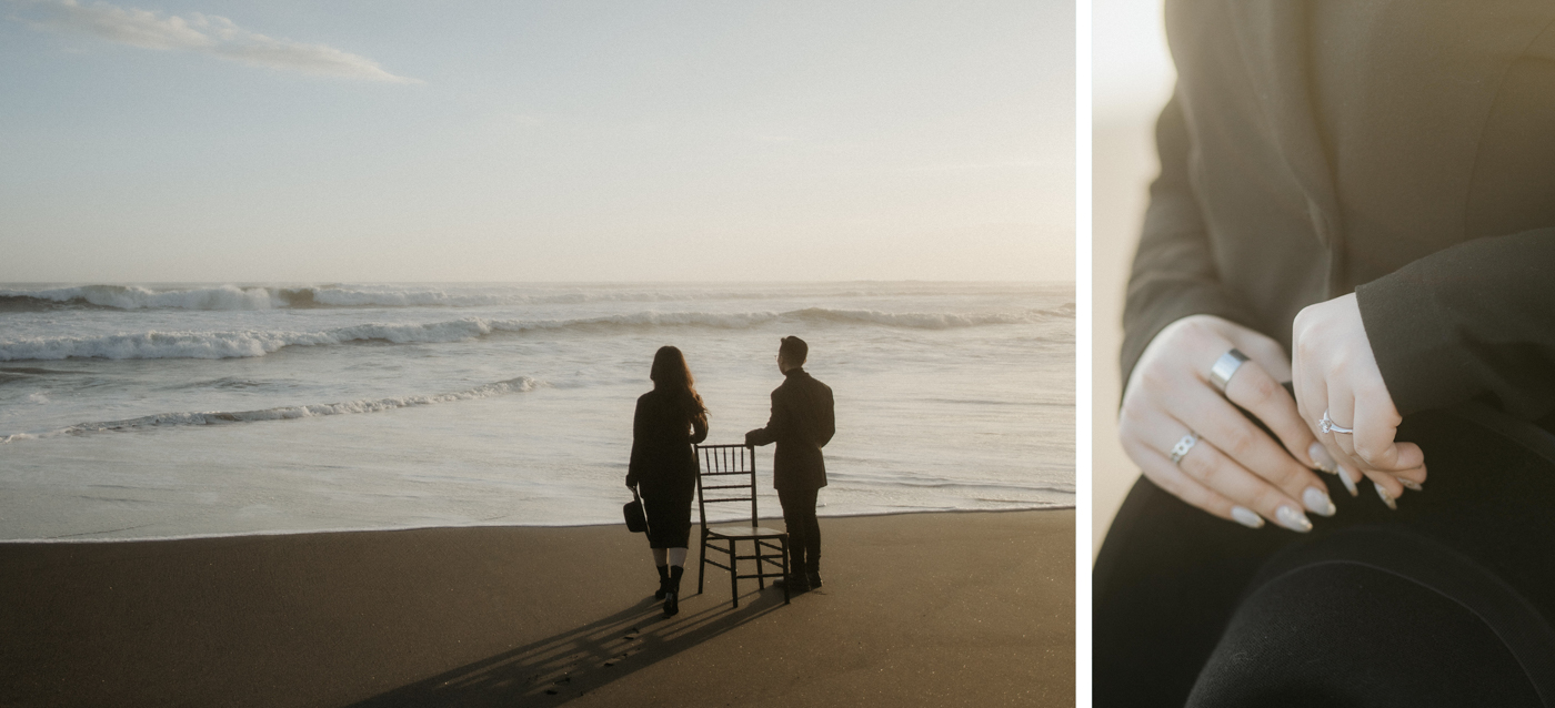 In Bali's enchanting embrace, where the ocean's whispers meet the shore's gentle caress, the couple stands, resplendent in sleek all-black attire, a striking contrast against the golden black sands and azure waters.