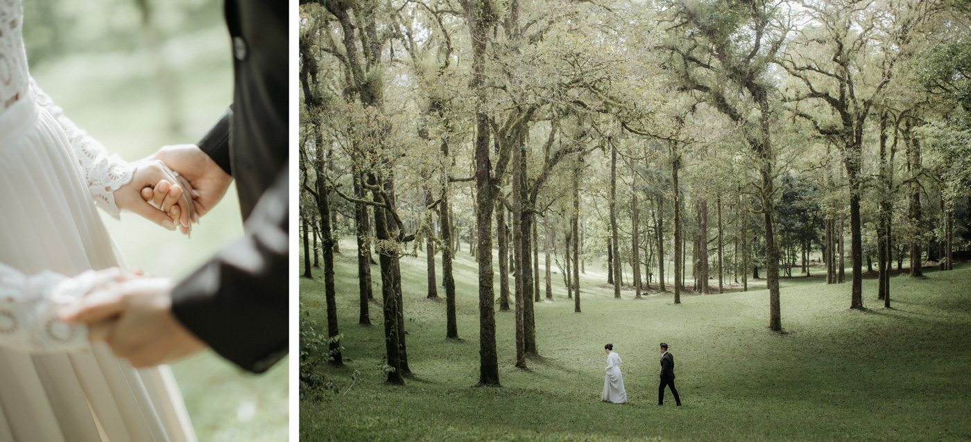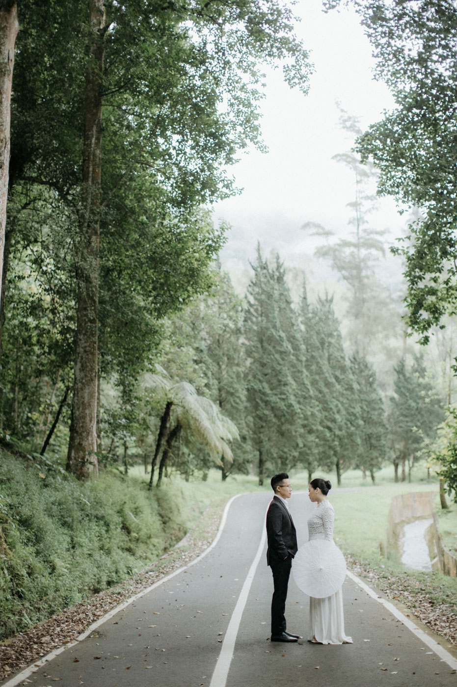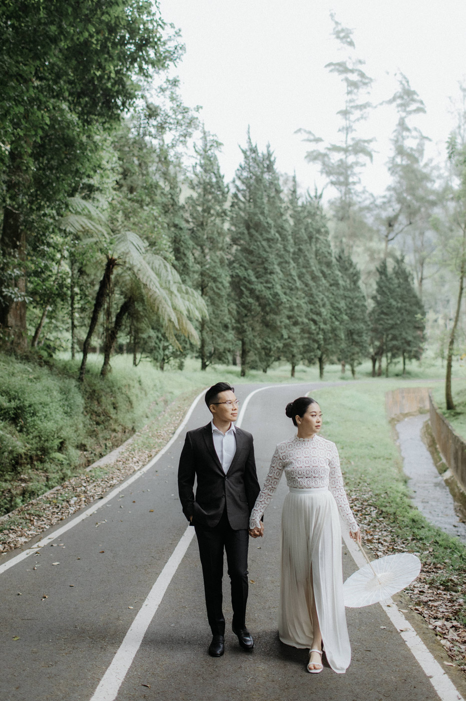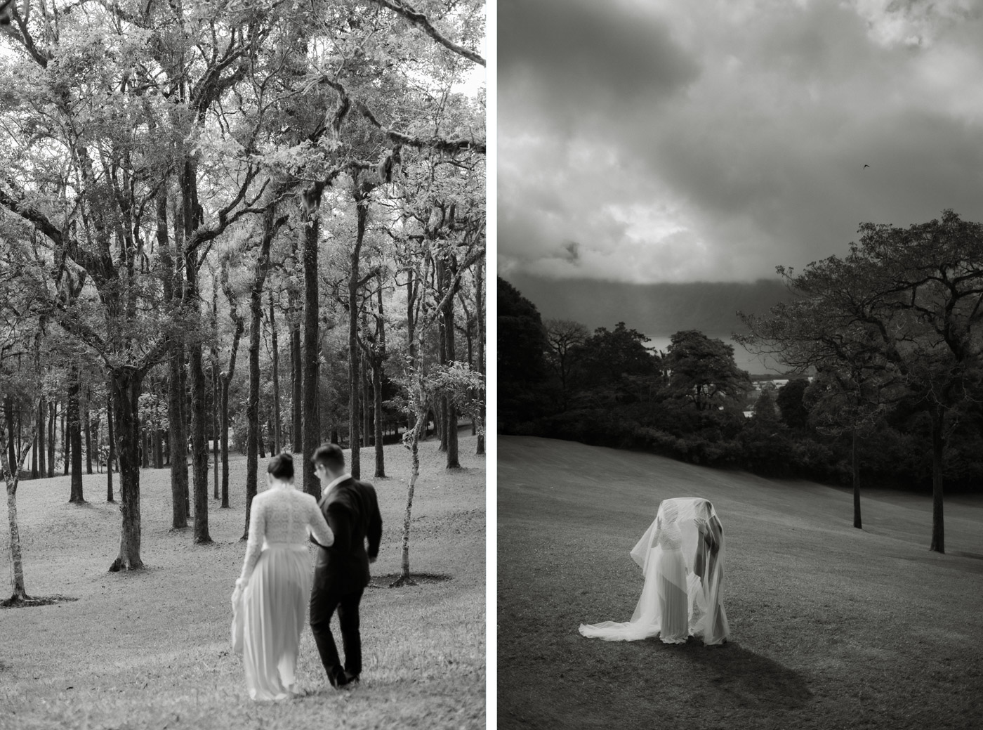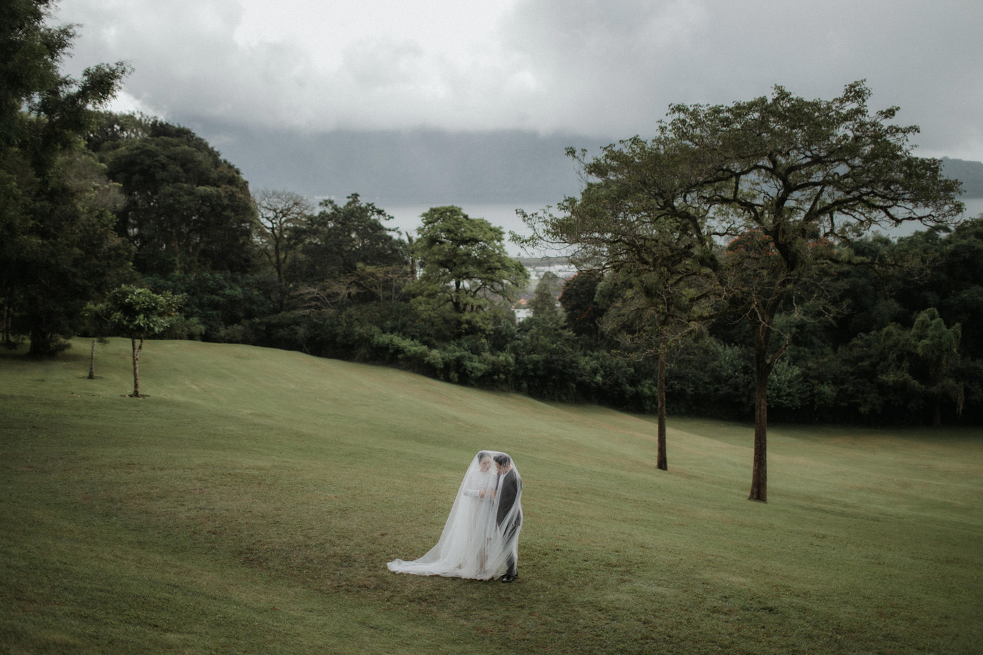 In Bali's enchanting embrace, where the ocean's whispers meet the shore's gentle caress, the couple stands, resplendent in sleek all-black attire, a striking contrast against the golden black sands and azure waters.